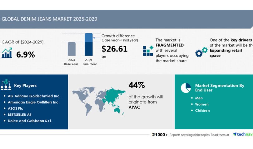 NEW YORK, Feb. 7, 2025 /PRNewswire/ — Report with market evolution powered by AI – The global denim jeans market size is estimated to grow by USD 26.61 billion from 2025-2029, according to Technavio. The market is estimated to grow at a CAGR of over 6.9% during the forecast period. Expanding retail space is driving market growth, with a trend towards recycling jeans from plastic and other materials. However, fierce competition in apparel industry poses a challenge. Key market players include AG Adriano Goldschmied Inc., American Eagle Outfitters Inc., ASOS Plc, BESTSELLER AS, Dolce and Gabbana S.r.l., EDWIN Europe GmbH, Esprit Holdings Ltd., G Star Raw eStore BV, Giorgio Armani SpA, Guess Inc., H and M Hennes and Mauritz GBC AB, Kering SA, Kontoor Brands Inc., Levi Strauss and Co., LVMH Moet Hennessy Louis Vuitton SE, Pepe Jeans SL, PVH Corp., Ralph Lauren Corp., Tapestry Inc., and The Gap Inc..
