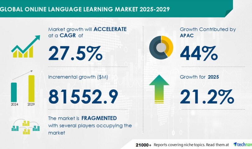 NEW YORK, Feb. 6, 2025 /PRNewswire/ — Report on how AI is driving market transformation – The global online language learning market size is estimated to grow by USD 81.55 billion from 2025-2029, according to Technavio. The market is estimated to grow at a CAGR of 27.5% during the forecast period. Cost benefits and flexibility of online language learning is driving market growth, with a trend towards artificial intelligence in language learning. However, threat from open sources poses a challenge. Key market players include Babbel GmbH, Berlitz Corp., Cengage Learning Inc., Chegg Inc., Duolingo Inc., Educational Testing Service, edX LLC, EF Education First Ltd., Enux Education Ltd., Houghton Mifflin Harcourt Co., inlingua International Ltd., iTutorGroup Inc., IXL Learning Inc., McGraw Hill LLC, New Oriental Education and Technology Group Inc., Sanako, Think and Learn Pvt. Ltd., uFaber, University of Oxford, and Voxy Inc..