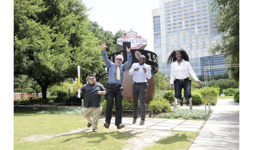 Helen Callier, far right, Founder and CEO of PermitUsNow next to PermitUsNow staff including Moruf Jimoh, Technical Manager in front of NFL Super Bow51 count down clock that PermitUsNow obtained permits for several clocks throughout Houston. This clock is in the Discover Green across from the GRB Convention Center. Permitted in February 2016, the NFL Experience was nearby in the park area. Photo taken in 2016.