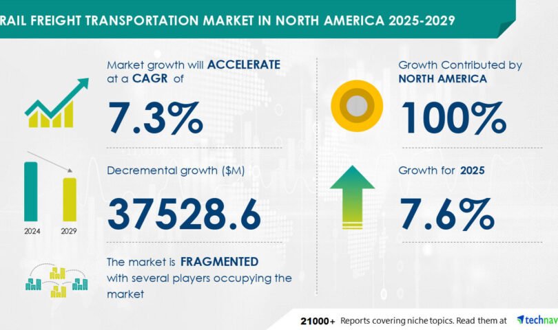 NEW YORK, Feb. 7, 2025 /PRNewswire/ — Report on how AI is driving market transformation – The rail freight transportation market in north america size is estimated to grow by USD 37.53 billion from 2025-2029, according to Technavio. The market is estimated to grow at a CAGR of 7.3% during the forecast period. Low transportation cost of freight is driving market growth, with a trend towards increasing use of artificial intelligence (AI) in rail infrastructure technology. However, growing competition from alternate freight services poses a challenge. Key market players include Berkshire Hathaway Inc., Brookfield Business Partners LP, Canadian National Railway Co., Canadian Pacific Kansas City, CSX Corp., DB Schenker, DHL Express Ltd., DSV AS, GeoMetrix Rail Logistics Inc., Grupo Mexico S.A.B. De C.V., Harsco Corp, Hub Group Inc., Kerry Logistics Network Ltd., Norfolk Southern Corp., Patriot Rail Co., RSI Logistics Inc., Union Pacific Corp., United Parcel Service Inc., VIA Rail Canada Inc., and WSP Inc..