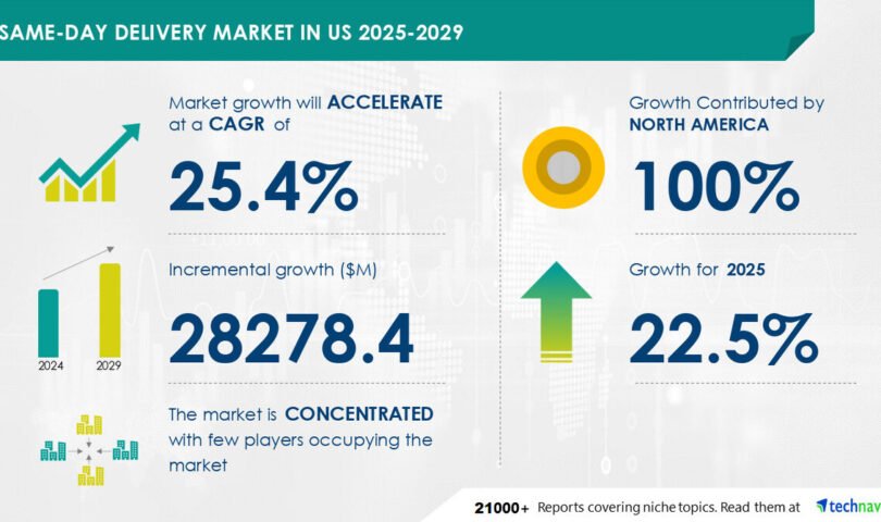 NEW YORK, Feb. 7, 2025 /PRNewswire/ — Report with the AI impact on market trends – The global same-day delivery market in us size is estimated to grow by USD 28.28 billion from 2025-2029, according to Technavio. The market is estimated to grow at a CAGR of 25.4% during the forecast period. Growing B2C e-commerce market in US is driving market growth, with a trend towards automation in same-day delivery market. However, established players increasingly adopting in-house delivery network poses a challenge. Key market players include Courier Express, Deutsche Post AG, FedEx Corp., Greenwich Logistics LLC, Last Mile Logistics, Power Link Expedite Corp., Target Corp., United Parcel Service Inc., USA Couriers, and Zipline International Inc..