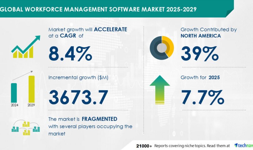 NEW YORK, Feb. 7, 2025 /PRNewswire/ — Report on how AI is driving market transformation – The global workforce management software market size is estimated to grow by USD 3.67 billion from 2025-2029, according to Technavio. The market is estimated to grow at a CAGR of  8.4%  during the forecast period. Regulatory compliance associated with workforce management is driving market growth, with a trend towards rising adoption of digital hr technology. However, high implementation and maintenance cost  poses a challenge. Key market players include ActiveOps PLC, Advanced Computer Software Group Ltd., ATOSS Software AG, Automatic Data Processing Inc., Bamboo HR LLC, Ceridian HCM Holding Inc., International Business Machines Corp., Koch Industries Inc., NICE Ltd., Oracle Corp, Panasonic Holdings Corp., Paycor HCM Inc., PTC Inc., Rippling People Center Inc., Sage Group Plc, SAP SE, UKG Inc., Verint Systems Inc., Workday Inc., and Zoho Corp. Pvt. Ltd..
