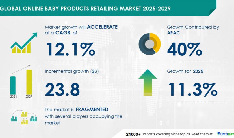 NEW YORK , Feb. 12, 2025 /PRNewswire/ — Report on how AI is driving market transformation – The global online baby products retailing market size is estimated to grow by USD 23.8 billion from 2025-2029, according to Technavio. The market is estimated to grow at a CAGR of 12.1% during the forecast period. Competitive pricing and discounts on baby products is driving market growth, with a trend towards growing omnichannel retailing. However, availability of counterfeit baby products poses a challenge. Key market players include Alibaba Group Holding Ltd., Amazon.com Inc., Baby Earth, Babydash Sdn Bhd, Babyshop Group, Bed Bath and Beyond Inc., Best Buy Co. Inc., Brainbees Solutions Pvt. Ltd., eBay Inc., J Sainsbury plc, JustKidding, Kidsroom, Mumzworld.com, Otway Technology Pty Ltd., Pupsik Studio Singapore, Qurate Retail Inc., Rakuten Group Inc., Saks Fifth Avenue, The Walt Disney Co., and Tru Kids Brand.