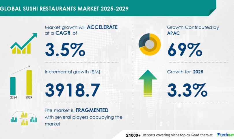 NEW YORK, Feb. 11, 2025 /PRNewswire/ — Report with market evolution powered by AI – The global sushi restaurants market size is estimated to grow by USD 3.92 billion from 2025-2029, according to Technavio. The market is estimated to grow at a CAGR of 3.5% during the forecast period. Increasing adoption of marketing strategies by vendors is driving market growth, with a trend towards innovative sushi dishes. However, adherence to stringent regulations and guidelines poses a challenge. Key market players include Bento Sushi, Choushimaru, FOOD and LIFE Co. Ltd., Genki Sushi Singapore Pte. Ltd., HANA GROUP SAS, Hinata Sushi, Innovative Dining Group, Kappa Create, Kura Sushi USA, Lettuce Entertain You Enterprises Inc., MASA, Pisces Sushi and Bistro, Restaurant Wasabi Sushi, Sakae Holdings Ltd., Sarku Japan, SUSHI EXPRESS GROUP Pte Ltd., Yoko Japanese Restaurant, and Zensho.