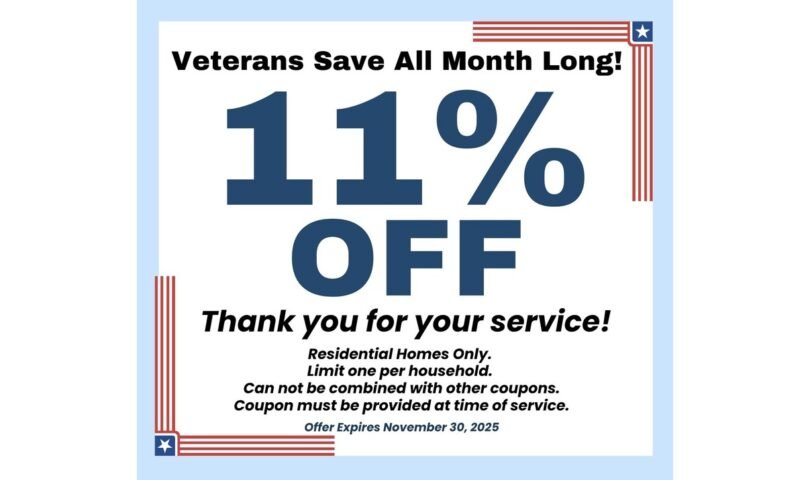 • Restrictions: Exclusively for veterans. Limit one per household. Cannot be combined with other coupons, promotions, or offers. Coupon must be presented at the time of service. HVAC is not offered in all service areas.