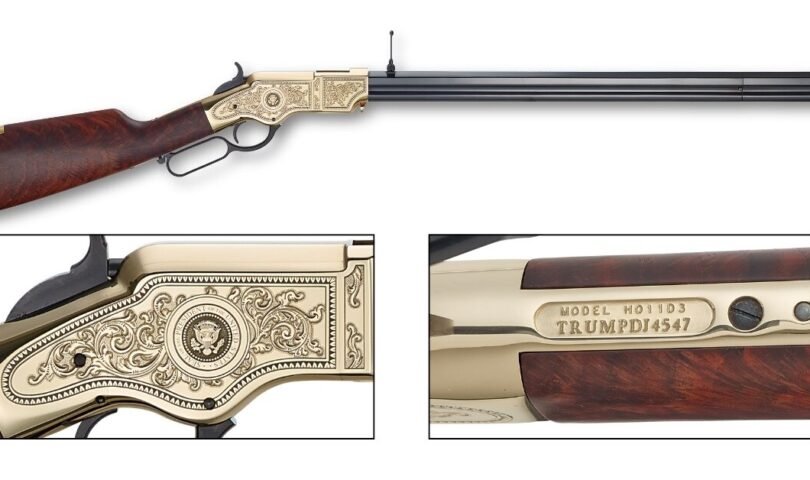 The exclusive “Presidential” Henry features the Seal of the President of the United States engraved on both sides of a polished brass receiver surrounded by ornate scrollwork inspired by the 19th-century masters of firearms engraving. It was built as a faithful line-for-line reproduction of the historic 1860 Henry, the world’s first successful repeating rifle. Its custom serial number, TRUMPDJ4547, pays tribute to the 45th and 47th President of the United States, Donald J. Trump. The winning bidder will also receive a hand-built, velvet-topped walnut tabletop display.