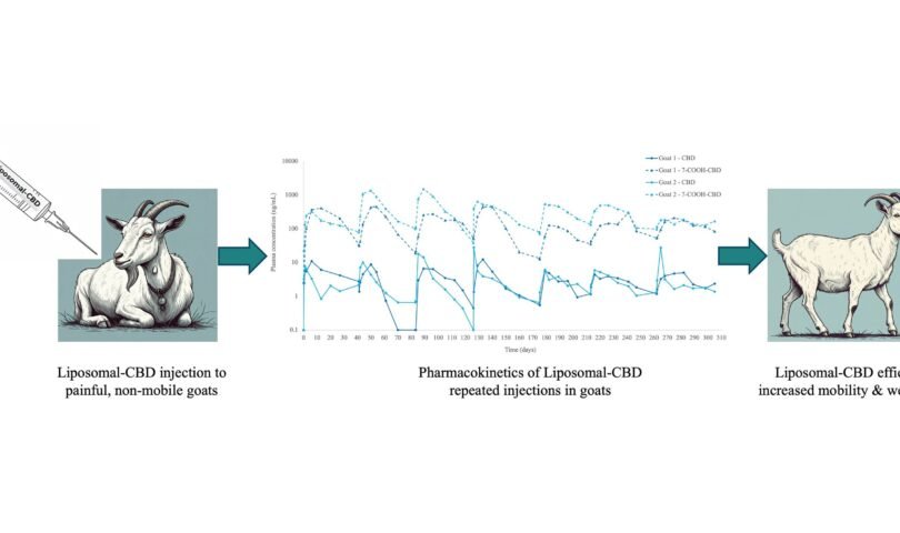 Two goats suffering from chronic and disabling painful condition were treated with subcutaneous Synthetic Liposomal Cannabidiol (LPT-CBD, 5 mg/kg) injections every six weeks for 10 months. Throughout the study, serial blood sampling was performed to assess CBD and its metabolite plasma concentrations and to evaluate hematological and biochemical profiles before and up to six weeks following each administration. Efficacy was assessed by the caregivers via quality of life (QoL) weekly scoring, and adverse effects were monitored. Key findings include: