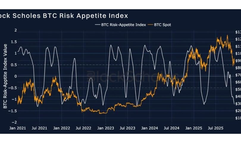 - The Fading Bear: Block Scholes’ proprietary Risk Appetite Index indicates that while sentiment is shifting in a positive direction, market participants have not yet turned bullish. This cautious stance is unsurprising given that both BTC and ETH continue to trade significantly below their all-time high levels.