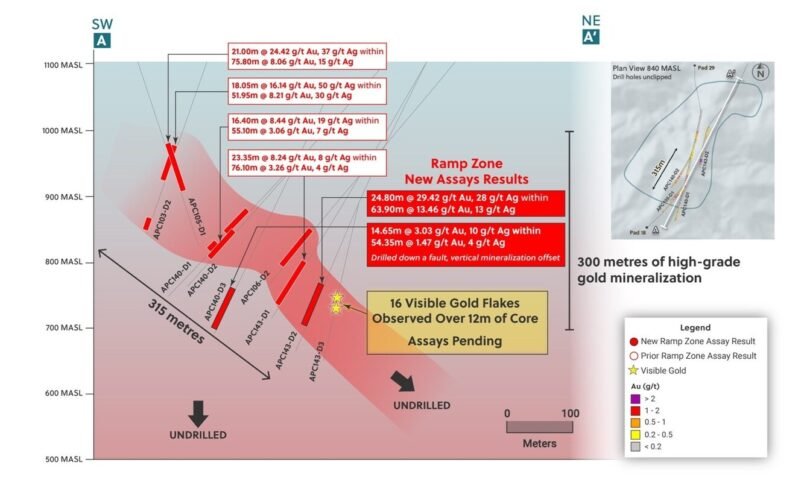 - Top-Grade Intercept at Ramp Zone: Drill hollow APC143-D2 intersects 24.80 metres @ 29.42 g/t gold and 28 g/t silver inside a broader mineralized zone of 63.90 metres @ 13.46 g/t gold and 13 g/t silver from 388.25 metres. This hollow represents the highest-grade and biggest grade dozen (gram x metres) intercept drilled to presen within the Ramp Zone.