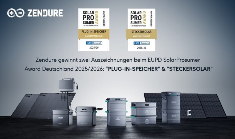 DÜSSELDORF, Germany, Dec. 16, 2025 /PRNewswire/ — Zendure, a leading innovator in solar energy solutions, has received multiple prestigious awards from EUPD Research for the 2025/26 cycle. The company was honored with two SolarProsumer Awards in Plug-in Solar and Plug-in Storage, as well as the EUPD Research Top Innovation Seal in Energy Management Systems (EMS).