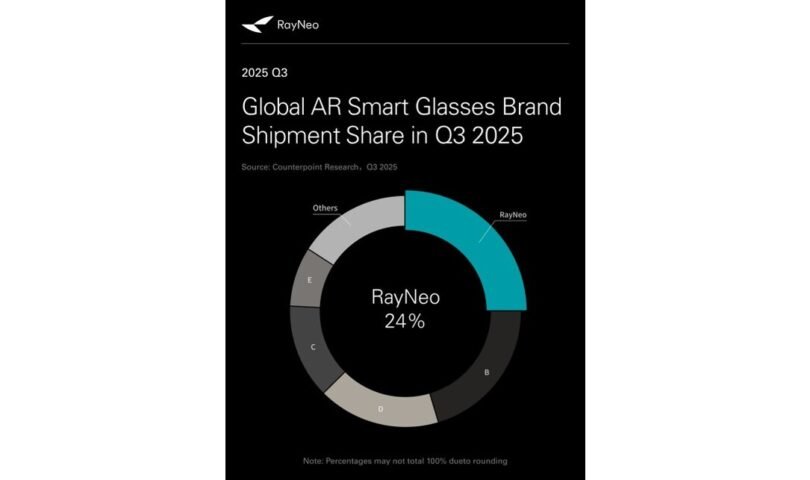 LOS ANGELES, 17 décembre 2025 /PRNewswire/ — RayNeo a consolidé son leadership dans le secteur de la réalité augmentée (AR) grand public, en atteignant les premières positions à la fois en termes de parts de marché et de ventes saisonnières. Selon le dernier rapport Q3 2025 Global AR Smart Glasses Brand Shipment Share de Counterpoint Research, RayNeo s’est classé au premier rang mondial pour le deuxième trimestre consécutif, avec une part de marché de 24,5%.
