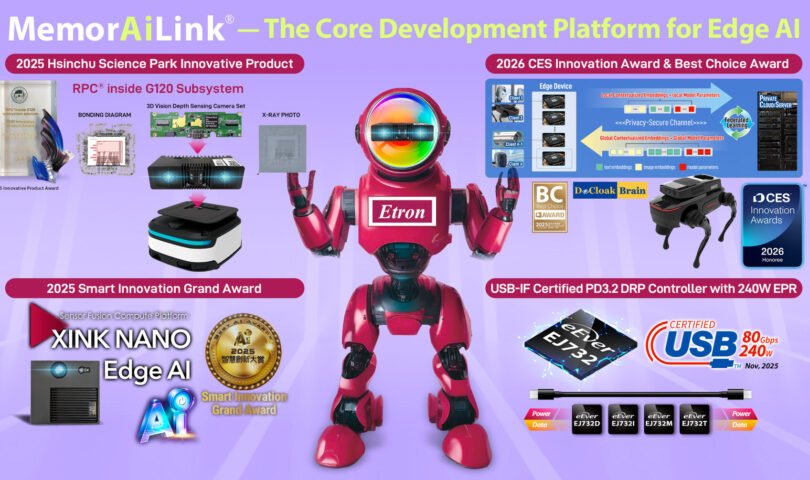 LAS VEGAS and TAIPEI, Jan. 4, 2026 /PRNewswire/ — Etron Technology (TPEx: 5351) will showcase its latest innovations at CES 2026 (January 6–9) under the core theme “MemorAiLink® Show Up,” highlighting comprehensive edge AI solutions across four key domains: memory, intelligent vision sensing, high-speed connectivity, and privacy computing. These innovations not only boost system performance and reduce design complexity, but also accelerate the deployment of smart automation ‒ riding the wave of the global edge AI and robotics market boom.Etron Technology (OTC Stock Code: 5351) will showcase its edge AI solutions under the core theme “MemorAiLink® show up” at CES 2026 (January 6–9), highlighting four key domains: memory, intelligent vision sensing, high-speed transmission, and privacy computing. These innovations not only enhance system performance and reduce design complexity but also accelerate smart automation deployment, riding the wave of the global edge AI and robotics market boom.