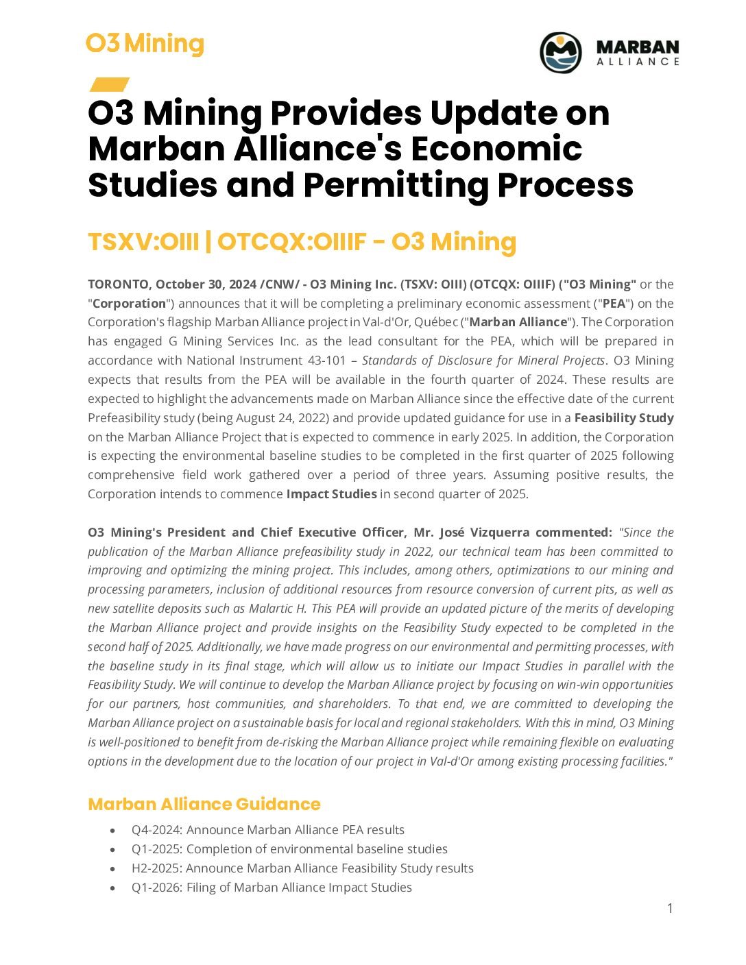 [ad_1] TSXV:OIII| OTCQX:OIIIF – O3 Mining TORONTO, Oct. 30, 2024 /PRNewswire/ – O3 Mining Inc. (TSXV: OIII) (OTCQX: OIIIF) (“O3 Mining” or the “Corporation“) pronounces that it’s going to be finishing a initial financial overview (“PEA“) […]