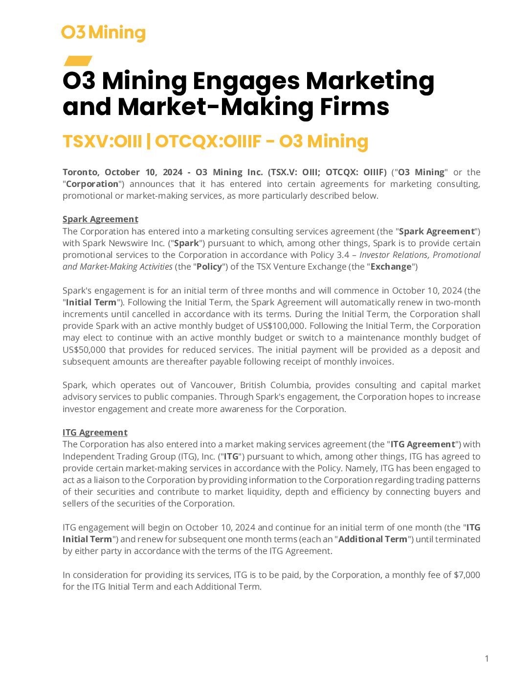 [ad_1] TSXV:OIII| OTCQX:OIIIF – O3 Mining TORONTO, Oct. 10, 2024 /PRNewswire/ – O3 Mining Inc. (TSXV: OIII) (OTCQX: OIIIF) (“O3 Mining” or the “Corporation“) broadcasts that it has entered into positive guarantees for advertising and marketing consulting, promotional […]